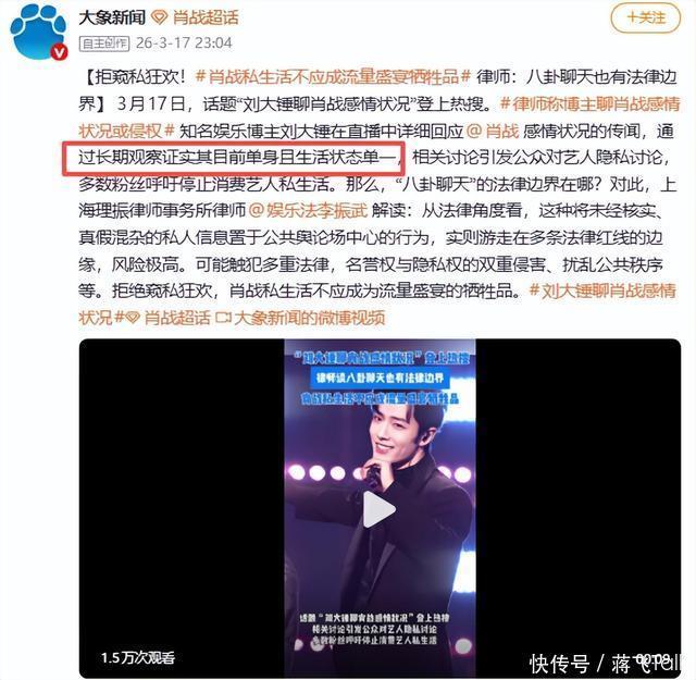 顶流艺人的私生活,向来是舆论紧盯的焦点,肖战更是常年被绯闻缠身。 从合作女星到身边工作人员,各种无厘头的恋爱瓜层出不穷,传得有模有样。 近期一位圈内的知名大V直接戳穿了肖战的“真实感情生活”,才知道我们原来都被“骗”了。 “战战”“沁姐”,这是早年肖战和李沁一起拍戏时互相喊对方的称呼。 一听就知道两人感情不错,但这也得益于两人经常合作拍戏。 从《斗罗大陆》到《狼殿下》再到电影《诛仙》,两人一直合作,从而也在剧外有了很好的友情。 而且能看出两人的互动是真的很甜,当时在拍摄电影《诛仙》的时候,在片场两人就一直互动,不仅会开玩笑,肖战还会因为李沁假装生气,而去抱着她道歉。 两人的合作缘分,还一直持续到了爆火的《梦中的那片海》。 两人在这部剧中更是好磕,尤其是两人后期的戏份,简直就是“高干文学”。 主要两人的气质还都很相似,都是温柔那一挂的。 戏里的甜蜜互动太多,观众入戏太深,就开始把角色感情强行套到现实里,到处找两人恋爱的“证据”。 片场里肖战提醒李沁注意道具、收工后一起走路聊天、采访时互相夸赞,这些正常的同事互动,都被过度解读。 还有人扒出两人偶尔穿同款风格衣服、戴相似配饰,就咬定是情侣款,把这些巧合当成恋爱实锤。 或许还有一些路人也觉得他俩很般配,而且肖战和李沁的观众缘也很好,路人口碑也很好。 因为两人都是那种一心只想好好拍戏的演员,不喜欢炒作。 所以有人还呼吁两人想要看到他们在一起,就像“罗晋和唐嫣之前一样”。 罗晋和唐嫣就是多次合作,日久生情,从好朋友到恋人,再到夫妻,一直携手走到现在。 但其实仔细看肖战和李沁的一些互动,其实就是好朋友来的,看起来更像“姐弟”。 再加上现在肖战的热度和当初已经不一样了,即使肖战和李沁合作《梦中的那片海》,也可以看出当时两人好像是有点避嫌的。 比如宣传活动没看到两人同框,花絮都很少有两人打闹的画面,一点都不像从前。 但这也是明星的一个无奈的地方。 因为明星在不火的时候,无人在意,还可以想干嘛干嘛,不需要太在乎镜头。 可明星一旦火了,需要在意的事情就多了。 尤其是男明星和女明星互动更是敏感,很有可能被传出绯闻。 更不用说肖战和李沁这种顶流明星,两人都处在事业上升期,更是会在乎自己的口碑和舆论。 而对于肖战来说,“人红是非多”这一句话在他身上都具象化了。 之前甚至还传出过肖战与他经纪人张晶的恋爱谣言。 明星和经纪人,这种搭配在娱乐圈还不少见,比如萧敬腾和他经纪人,胡歌与他经纪人。 可也不是明星都会与经纪人真的结婚的。 而肖战与经纪人张晶的事情更是无稽之谈。 只能说两人是很好的朋友,张晶陪伴他走过了最艰难的低谷期。 从肖战刚出道没名气的时候,张晶就一直带他,从执行经纪做到经纪总监,两人共事长达八年。 拍戏时张晶全程跟组,出差时两人同行,工作上形影不离,这份长久的陪伴被别有用心的人恶意解读。 网传的两人同游海外、穿同款衣服,其实都是工作行程和团队统一穿搭,根本不是情侣约会。 甚至有人造谣张晶的穿搭是肖战供养,编造各种虚假细节,把正常的职场搭档抹黑成恋人。 针对这些谣言,肖战打假小队和工作室多次发文辟谣,明确表示两人只是经纪人和艺人的关系,艺人一直单身。 感觉就是因为明星与经纪人的这层身份,现在很多工作室招员工的时候就会限制性别,有的还不会要有粉籍的,就是怕传出绯闻。 这虽然看起来很奇怪,但也顺势少了一点传绯闻的可能性。 而肖战身为顶流,他的热度是真的居高不下。 不然他也不会在今年的微博之夜上收获King的荣耀,这就代表了他的热度高。 即使肖战现在已经是只有宣传作品的时候才会多出现,但还是有的时候挡不住绯闻的风波。 而在3月17日,经常曝光娱乐圈明星的狗仔刘大锤也直接凭借一句话,点破了肖战现在的感情生活。 刘大锤表示,自己团队蹲守肖战长达数月,跟踪了他的住所、行程和私下生活,掌握了大量一手素材。 他明确表态,肖战目前是实打实的单身状态,长期独自居住在北京的公寓里,私生活干净又简单。 肖战平时几乎没有私人社交,日常就是剧组和家两点一线,连朋友串门都很少,根本没有时间谈恋爱。 而刘大锤的这一爆料,还让肖战收获了一波好口碑。 而且现在的肖战,早已经过了那个“一有点风吹草动就会深陷舆论风波”的时候了。 因为他大部分时间都投入到了拍戏和工作中。 从《陈情令》爆火后,他没有沉溺于流量,而是接连交出《斗罗大陆》《梦中的那片海》《玉骨遥》等优质作品。 每一部作品的角色都截然不同,演技也在一步步提升。 这不,最近肖战更是风光无限。 因为他凭借《藏海传》的精彩演出,成功荣获了品质盛典的视帝。 这也证明了肖战的演技和实力,他早已不是很多人刻板印象中的“一夜爆红的流量小生”,而是真正的实力派演员。