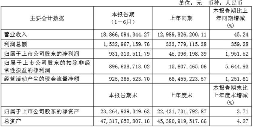 数据显示,北方稀土上半年实现营收188.66亿元,同比增长45.24%。归属于上市公司股东的净利润9.31亿元,同比增长1951.52%。报告期内,公司不进行利润分配及公积金转增股本。