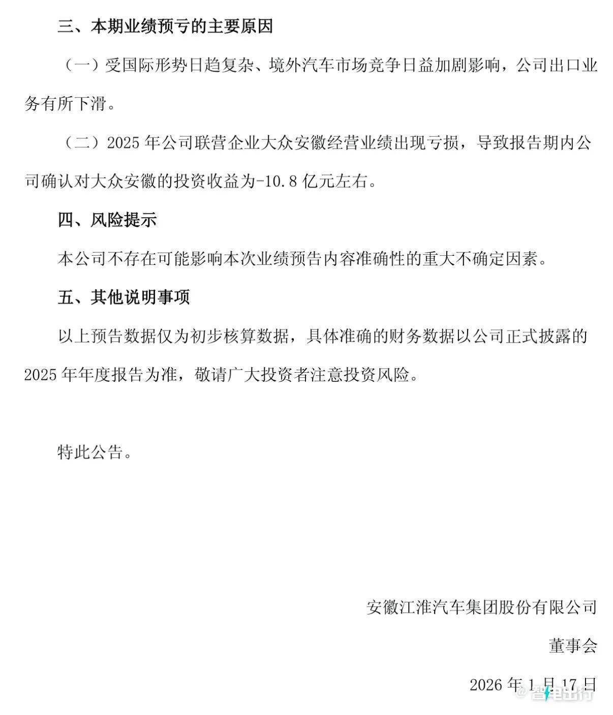 江淮汽车持有大众安徽25%股份,由此测算大众安徽年度总亏损应为10.8亿元*4